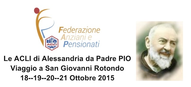 La sede provinciale delle Acli di Alessandria, in collaborazione con la Fap provinciale (Federazione Anziani e Pensonati Acli), organizza la visita a San Giovanni Rotondo nei giorni 18-19-20-21 ottobre, Il viaggio è aperto a tutte le persone che desiderassero partecipare (il viaggio si effettuerà al raggiungimento minimo di 40 partecipanti) e la quota individuale di partecipazione è di 260,00 euro (la quota comprende: viaggio in bus gran turismo con servizi igienici, sistemazione in camera doppia, colazioni, pranzi e cene indicati nel programma. La quota non comprende: supplemento per camera singola 15,00 euro, pasti liberi ed extra in genere). La caparra di 100,00 euro è da versare al momento dell’iscrizione mentre il saldo entro l’11 ottobre.