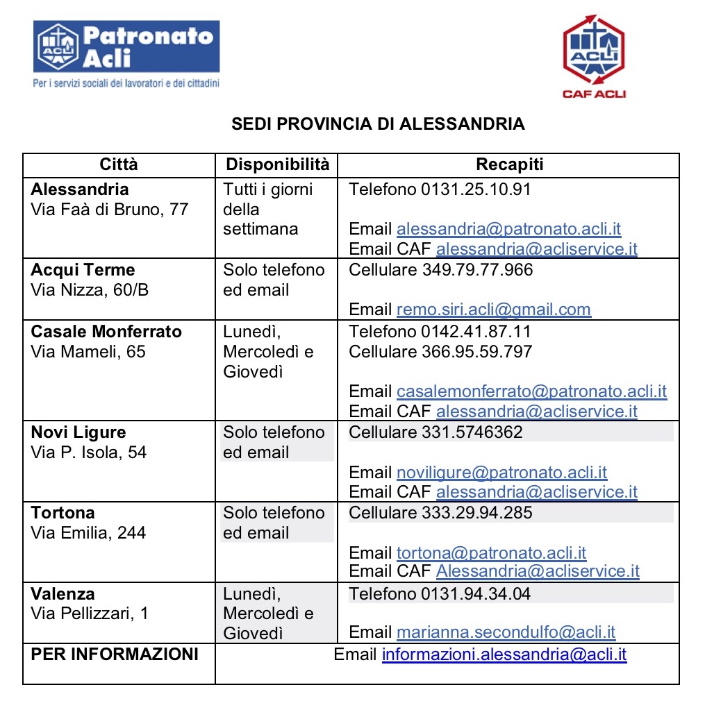 Considerata la diffusione del Coronavirus, al fine di prevenire possibili contagi così come previsto dal DPCM 11 marzo 2020, gli uffici del Patronato ACLI e del CAF ACLI della provincia di Alessandria rimarranno chiusi al pubblico, ma i nostri operatori saranno a vostra disposizione per continuare a garantire un servizio di pubblica utilità. Per avere maggiori informazioni potrete contattarci attraverso il numero unico 0131.25.10.91 e/o l’email informazioni.alessandria@acli.it