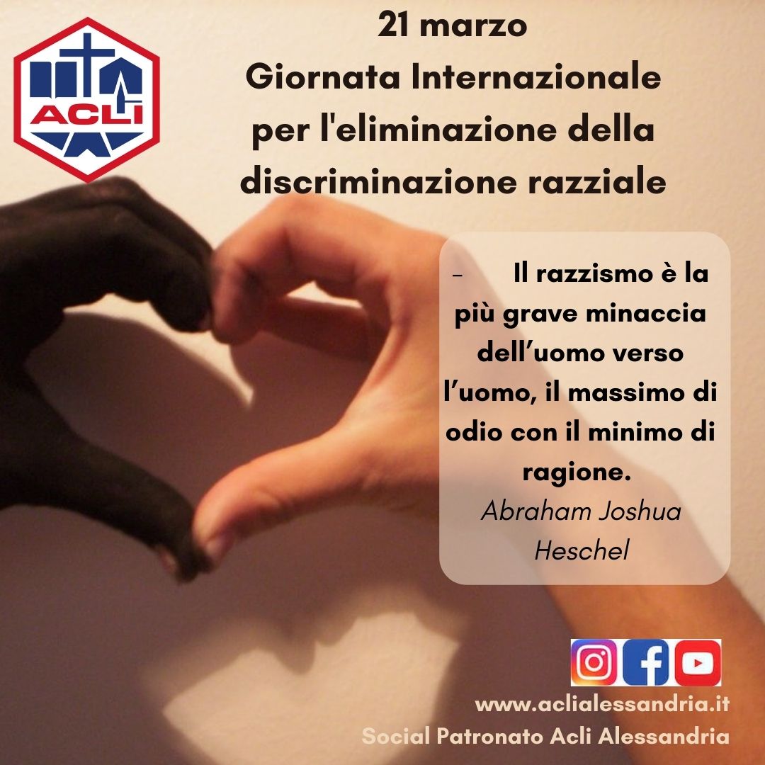 Oggi, Giornata Internazionale per l’eliminazione della discriminazione razziale e le ACLI della provincia di Alessandria dicono NO al razzismo con le parole di Abraham Joshua Heschel: “Il razzismo è la più grave minaccia dell’uomo verso l’uomo, il massimo di odio con il minimo di ragione”.