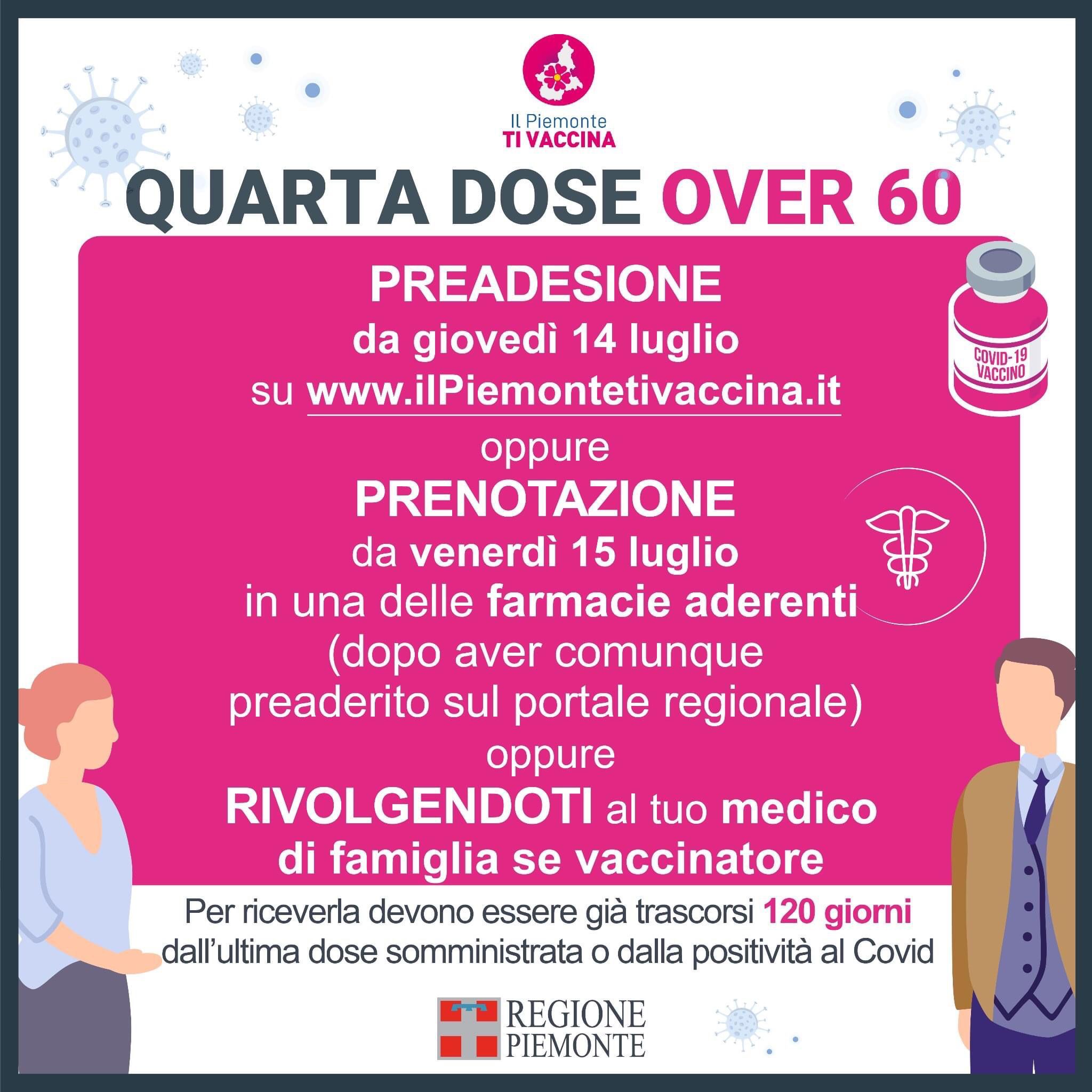La Regione Piemonte informa che dal 14 luglio le persone over 60 anni possono compilare la preadesione per la QUARTA dose vaccino Covid su www.ilPiemontetivaccina.it oppure prenotarsi presso le farmacie aderenti o rivolgendosi al proprio medico di famiglia,