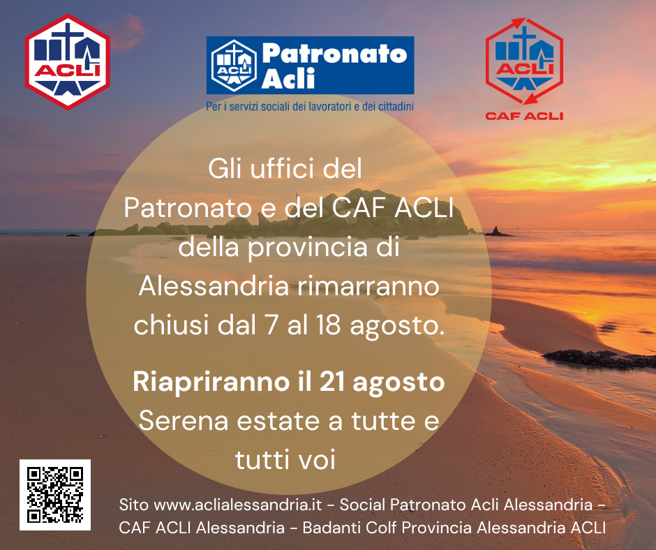 Si comunica che gli uffici del Patronato ACLI e del CAF ACLI della provincia di Alessandria (quindi ad Acqui Terme, Alessandria, Casale Monferrato, Novi Ligure, Tortona e Valenza) rimarranno chiusi per la pausa estiva dal 7 al 18 agosto. Si riaprirà il 21 agosto con i consueti orari.