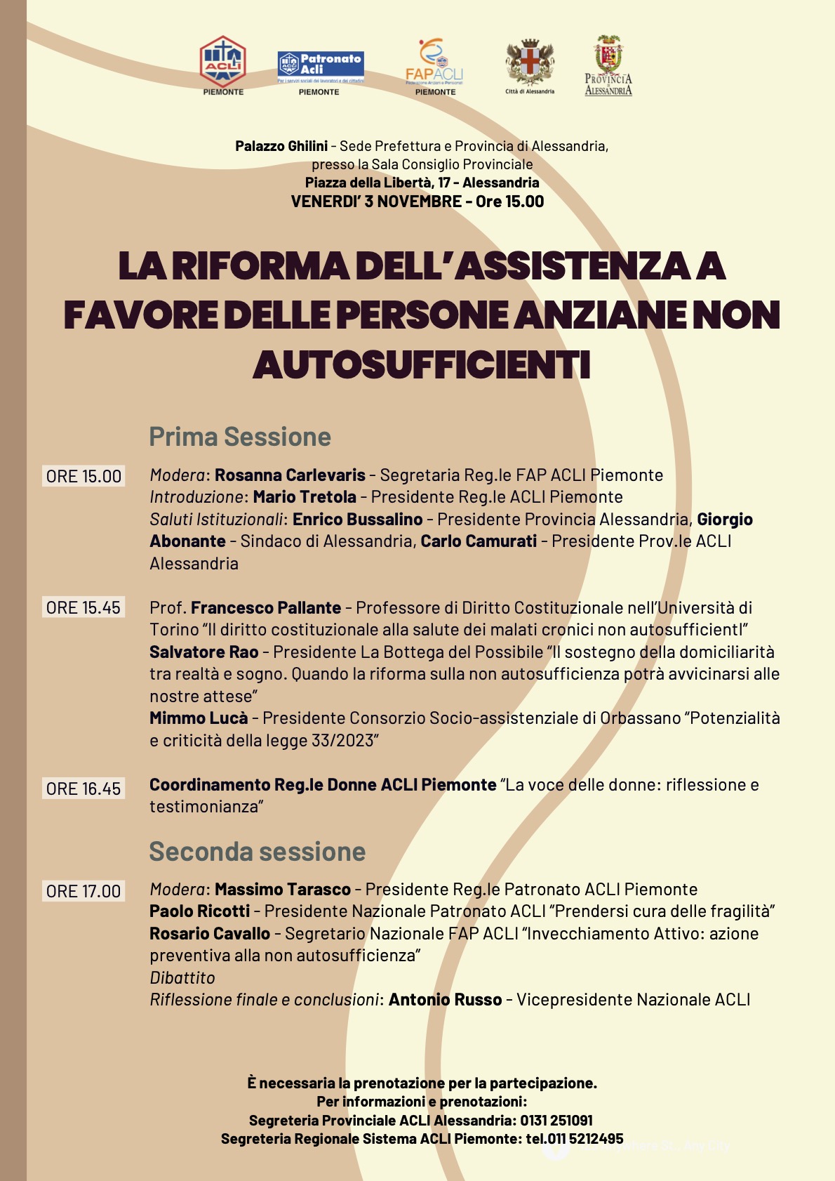 Venerdì 3 Novembre 2023 dalle ore 15,00 alle ore 18,30, presso Palazzo Ghilini – Piazza della Libertà, 17 ad Alessandria – si svolgerà il Seminario Regionale “La riforma dell’assistenza a favore delle persone anziane non autosufficienti – Legge delega 33/2023” promosso dalle ACLI, dalla FAP ACLI e dal Patronato ACLI.