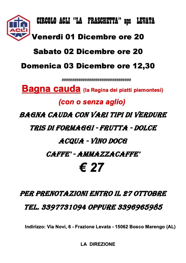 Il Circolo ACLI La Fraschetta aps in via Novi, 6 – Frazione Levata a Bosco Marengo (AL) aspetta tutte e tutti i soci ACLI, FAP ACLI e tutte le persone che desiderano degustare la bagna cauda (con o senza aglio), il tipico piatto piemontese.
