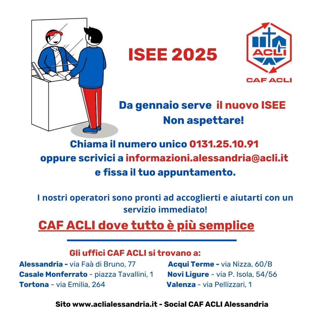 L’ISEE scade il 31 dicembre di ogni anno quindi ogni anno a gennaio bisogna rifarlo per l’anno in corso. Non aspettare, chiama il numero unico 0131.25.10.91 oppure scrivi a informazioni.alessandria@acli.it e fissa il tuo appuntamento con il CAF ACLI provincia Alessandria più vicino a te.