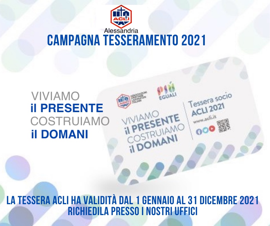 Ricordiamo a tutti i nostri Associati che è possibile rinnovare la Tessera ACLI per il 2021. Con la Tessera ACLI si potrà usufruire dei servizi offerti da Patronato e CAF a tariffe agevolate e avere sconti riservati presso i nostri partner convenzionati. L’iscrizione alle ACLI avviene presso tutti gli Uffici ACLI e i Circoli ACLI della provincia di Alessandria, la tessera è valida dal 1° gennaio al 31 dicembre 2021.