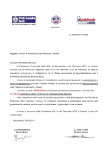 Nel pomeriggio di giovedì 27 marzo si è tenuto presso la sede provinciale Acli di Alessandria il corso di formazione e di specializzazione per i Promotori Sociali del sistema Acli, tale incontro è stato organizzato dalle Acli di Alessandria in accordo con le Acli del Piemonte.