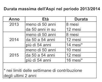Dall’anno 2016, a regime, l’indennità spetta per 12 mesi ai lavoratori con meno di 55 anni e per 18 mesi a quelli con un’età pari o superiore a 55 anni (nel limite comunque del numero di settimane di contribuzione versate nei due anni precedenti). Durante il periodo transitorio 2013/2015 la durata massima dell’Aspi varia in base all’età del lavoratore (vedere tabella allegata). I periodi di fruizione sono coperti da contribuzione figurativa.