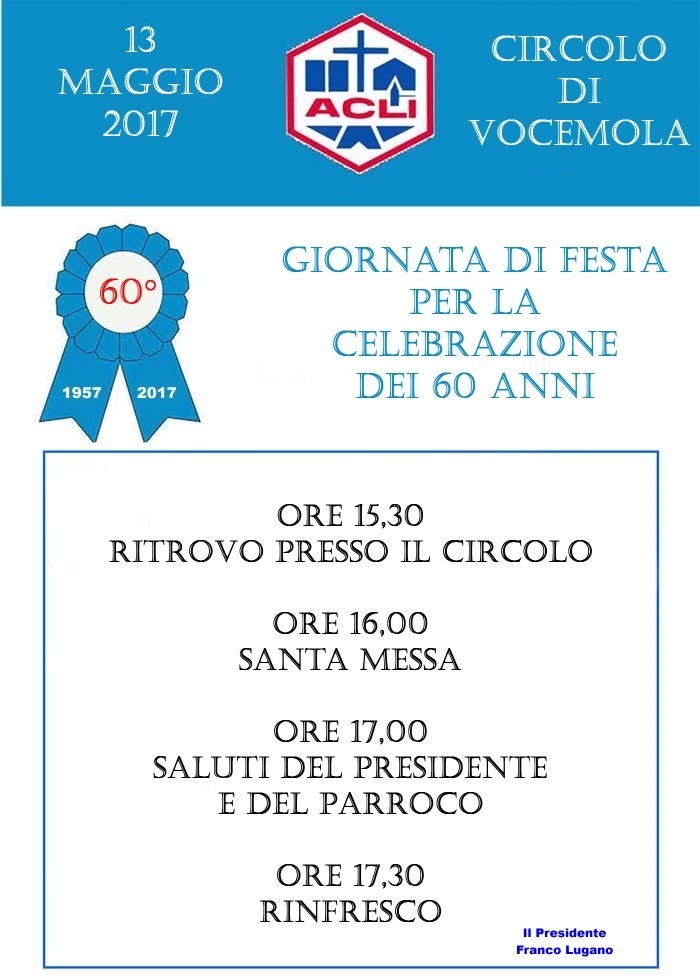 Sabato 13 maggio il Circolo ACLI Vocemola festeggerà il 60° anniversario della fondazione 1957-2017 e invita tutte le persone a partecipare alla manifestazione. Il programma sarà il seguente: