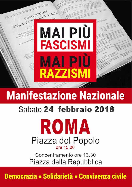 La manifestazione “Mai più fascismi, mai più razzismi” è stata promossa da oltre 20 associazioni e partiti tra cui ANPI, ACLI, Libera, Articolo 21, PD, CGIL, CISL, Istituto Alcide Cervi, Liberi e Uguali, Libertà e Giustizia, UISP, Ucei (Unione delle comunità ebraiche italiane), Unione degli universitari, Rete degli studenti medi, Rete della conoscenza, movimento LGBTQI, Rete Nobavaglio, Il corteo partirà alle ore 13,30 da piazza della Repubblica e arriverà alle ore 15,00 in piazza del Popolo dove avrà luogo la manifestazione che sarà presentata dall’attore Giulia Scarpati. Il programma sarà il seguente: lettere e racconti di partigiane e partigiani lette da studentesse e studenti, testimonianza di un giovane migrante, esibizione dei Modena City Ramblers, messaggio video della Senatrice a vita Liliana Segre. Concluderà la Presidente nazionale ANPI, Carla Nespolo.