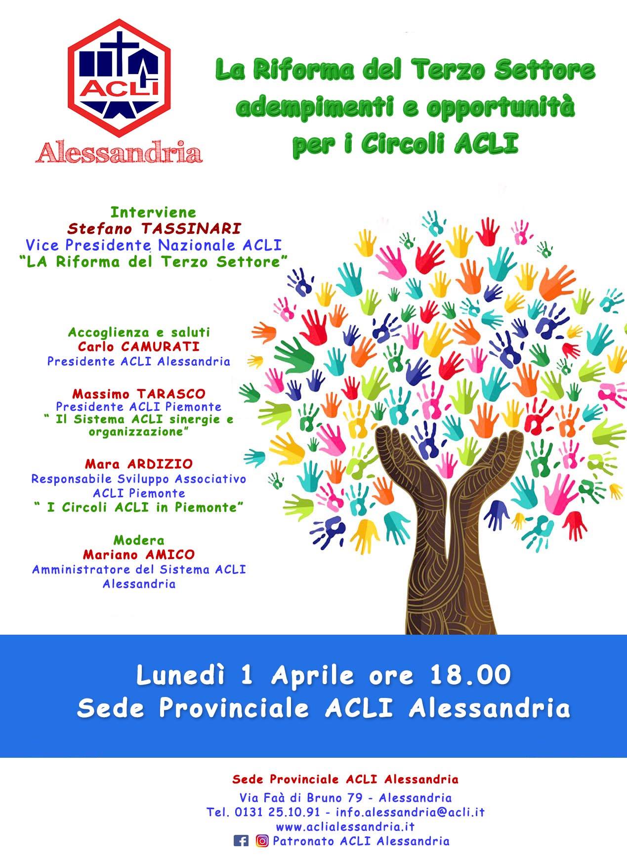 Lunedì 1° aprile 2019 alle ore 18,00 presso la sede ACLI della provincia di Alessandria (in via Faà di Bruno 79) sarà organizzato un incontro su “La Riforma del Terzo Settore adempimenti e opportunità per i Circoli ACLI”. Tutti i Circoli ACLI sono invitati.