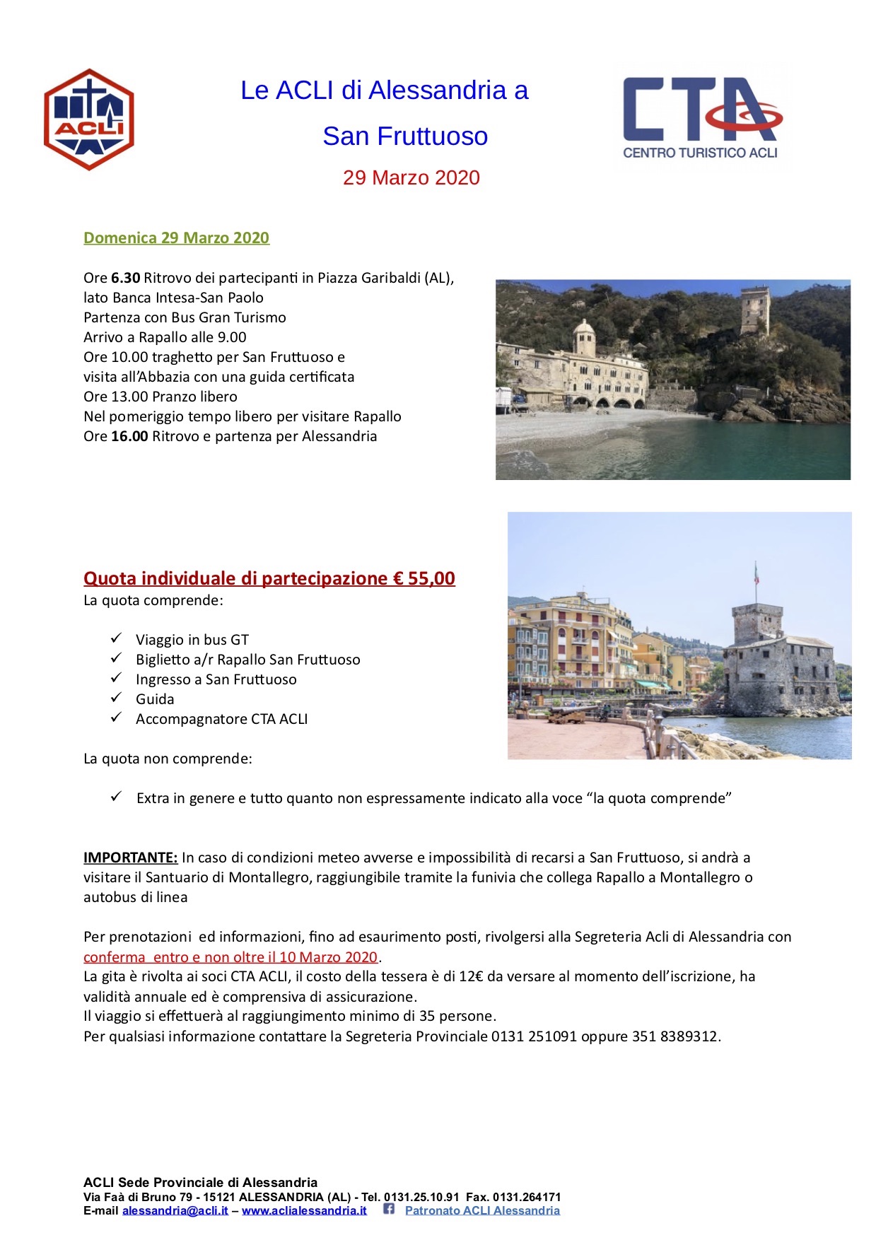 La quota individuale di partecipazione è di 55,00 euro e comprende: viaggio in bus GT, biglietto battello Rapallo-San Fruttuoso, guida e accompagnatore CTA ACLI. La quota non comprende extra in genere e tutto quanto non inserito nella voce “la quota comprende”. Iscrizioni entro e non oltre il 10 marzo, la gita verrà confermata con un minimo di 35 partecipanti. La gita è rivolta ai soci CTA ACLI, il costo della tessera è di 12,00 euro da versare al momento dell’iscrizione, ha validità annuale ed è comprensiva di assicurazione.