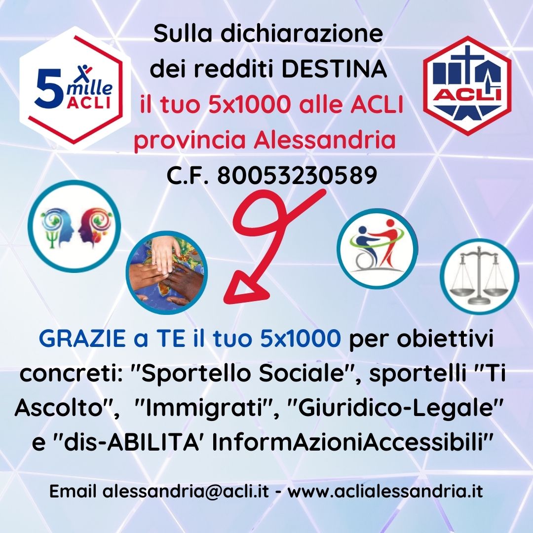 Sulla dichiarazione dei redditi DESTINA il tuo 5X1000 alle ACLI aps provincia Alessandria indicando il CF 80053230589