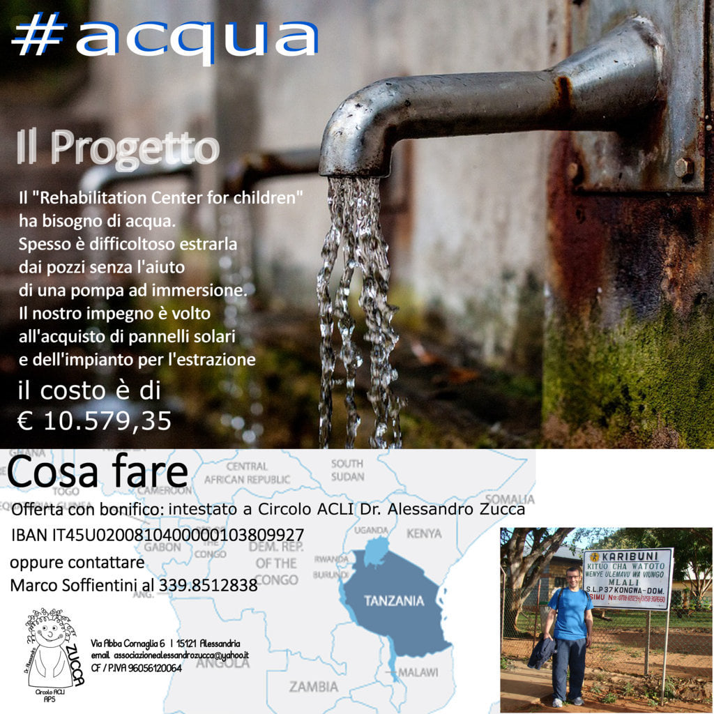 #acqua è il Progetto 2021 del Circolo ACLI Dr. Alessandro Zucca sostiene il “Rehabilitation Center for children” in Tanzania. Spesso per il centro è difficoltoso estrarre acqua dai pozzi senza l’ausilio di una pompa a immersione, per questo motivo il Circolo ACLI ha creato il progetto #acqua che è volto all’acquisto di pannelli solari e dell’impianto completo di estrazione. Sosteniamo tutti insieme questo progetto!