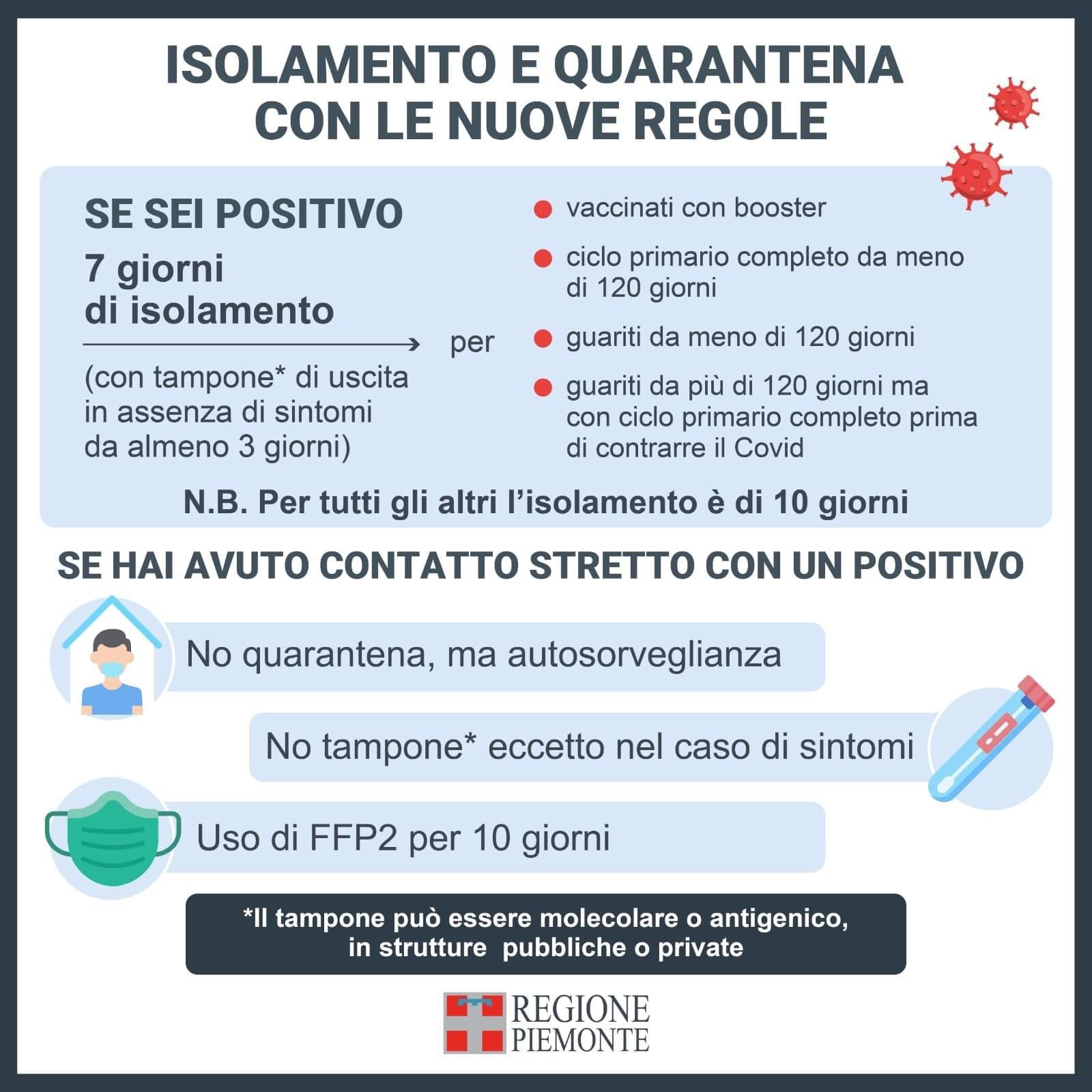 La Regione Piemonte ha pubblicato le regole in vigore dal 1° luglio sull’isolamento e la quarantena. Inoltre è attivo il nuovo numero regionale “Info Covid” 0115663169 che sostituisce il numero verde.