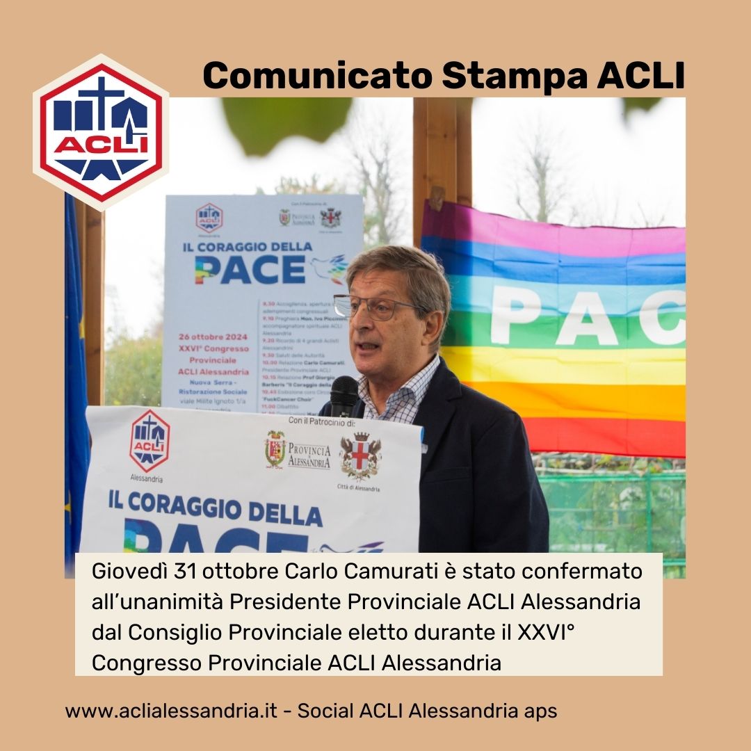 Giovedì 31 ottobre Carlo Camurati è stato confermato all’unanimità Presidente Provinciale ACLI Alessandria dal Consiglio Provinciale eletto durante il XXVI° Congresso Provinciale ACLI Alessandria del 26 ottobre scorso. Con la disponibilità, pazienza, responsabilità che lo contraddistingue Carlo Camurati guiderà le nostre ACLI per i prossimi quattro anni.